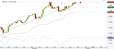 Na wykresie 4- godzinowym pary USD\CHF wyrysował się podwójny szczyt, Taka formacja jest zapowiedzią spadków.Spadek kursu przewiduję do poziomu 0,99400