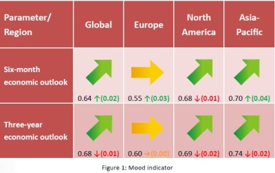 Experts became less optimistic about the North American region as both the six-month and three-year expectations worsened slightly. The six-month outlook declined 0.01 to 0.68, while the three-year sentiment fell by 0.02 to 0.69, which is October 2012 low.