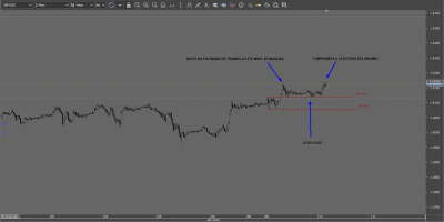 Después de hacer nuestra entrada al mercado, deberiamos de haber tomado un cierre parcial de la posición en el uno a uno, pero debido a que las normas del concurso no lo permite, asumimos la perdida del stop y ahora nos posicionamos en compra. En este momento nuestro sistema nos indica que debemos cerrar el 75 % de la operación en el uno a uno y luego hacer trailing stop.