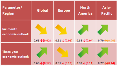- While North America posted a slight decline in six-month outlook, index, measuring economic prospects of the region within next three years, slumped by 0.11, the sharpest fall on record.