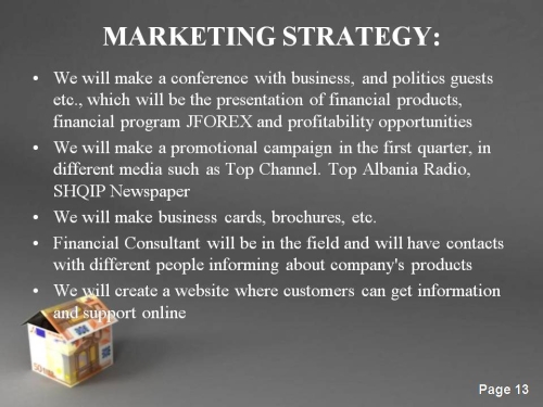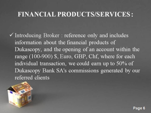 I have a dream, the dream to open my own office representatives of a brokerage company, i like to create a cooperation with Dukascopy, and this is the main reason why i'm here...so because of this reason i created my business plan with 30 pages in albanian language, written in detail all key points, but is not completed yet, because i have to work more on budget ,cash flow and balance sheet analysis but i will show you the most important things in powerpoint images...