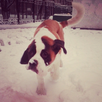 Мик платит деткам взаимностью - любит их, с удовольствием играет и даже составляет компанию в катании с горки (щенок сенбернара, едущий на попе с ледяной горки - то еще зрелище, поэтому обойдёмся, пожалуй, без фото=))