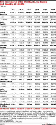 Currently, internet-based sales in North America are greater, projected to be almost $420 bln this year, a more modest, but still healthy 12.5% increase. eMarketer projects the Asian-Pacific region to surpass North American sales next year.