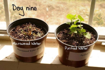 This is the fact about using the Microwave.Here is a Science fair project presented by a girl in a secondary school in Sussex . In it she took filtered water and divided it into two parts. The first part she heated to boiling in a pan on the stove, and the second part she heated to boiling in a microwave. Then after cooling she used the water to water two identical plants to see if there would be any difference in theÿgrowth between the normal boiled water and the water boiled in a microwave. She was thinking that the structure or energy of the water may be compromised by microwave. As it turned out, even she was amazed at the difference, after the experiment which was repeated by her class mates a number of times and had the same result.