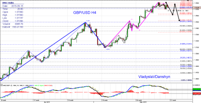 цена находится в четвертой волне и от первой импульсной - А - (-1.57011-1.58144-) пойдет вниз с первыми целями в районе: 1.56145-1.56311 и вторыми целями: 1.55200. Еще возможен и второй вариант, когда цена будет находиться во флете.