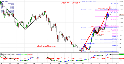 Тренд начался от 30/31.10.2011 от отметки 75.540 (-LOW-) с интервенции Банка Японии. Пиком волны = А = стала отметка 103.732 (-high-) от 22.05.2013. Эта волна = А = задала цели вверху в районе 176,4% по сетке Фибо - это отметка 125.271.