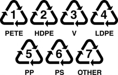 1. PET или PETE или одноразовые бутылки - самый распространенный тип пластика, предназначен исключительно для одноразового пользования, при повторном использовании такой бутылки этот тип пластика может выделять в содержимое бутылки тяжелые металлы и вещества влияющие на гормональный баланс человека.