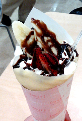 When visiting Tokyo, you should definitely try a crepe. My favourites are the ones with strawberries and whipped cream. I often got the strawberry cream cheesecake one. They roll the crepes up with a slice of yuumy cheesecake in the middle. It's called the nama ichigo cheesecake. They are especially famous in Harajuku which is a really fashionable and interesting place in Tokyo.