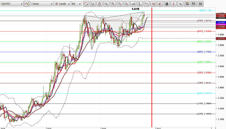 На недільному графіку валютної пари після сильної хвилі росту (див. малюнок ) валютна пара перейшла в коррекційну фазу на пониження що пізніше вилилось в завершальну хвилю росту і в данний момент це можна характеризувати патерном зображеним на малюнку. Фаза в рівні 1.618 часто буває заключною. Тому валютна пара може бути цікавою в довгостроковому плані пониження.