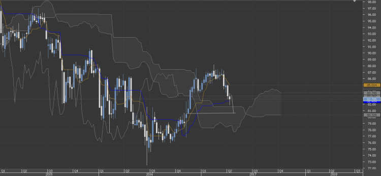 Current monthly price action shows no bearishness so far. The 61.8% fib expansion at 91.19 is a likely target for this pair. Although, a little price retracement is expected from the weekly chart, overall bullish scenario should dominate.