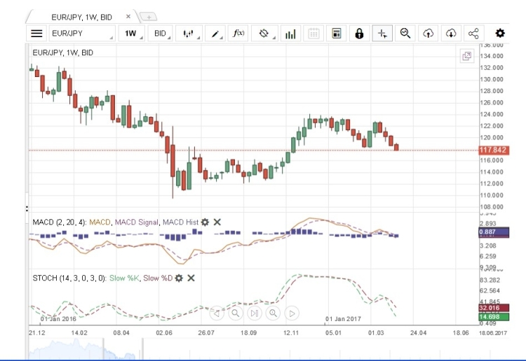Personally, I like using the MACD and Stoch indicators, in order to predict the closing price of the EURJPY on the June 1st. Last year, the trend of the pair is bearish during the first 26 weeks, and bullish during the next 26 weeks. Almost surely, the bearish trend shall repeat this year. The Stoch (14, 3, 3) setup strongly confirms the repetation of the trend. If so, then the closing price of the pair shall touch 110.13 on the next June 1st.