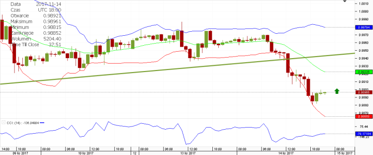 Przełamanie dołem linii trendu wzrostowego jest sygnałem do spadków o większym wymiarze Możliwy jest powrót kursu USD\CHF do przełamanej linii, do poziomu 0,99400,następnie spadki.