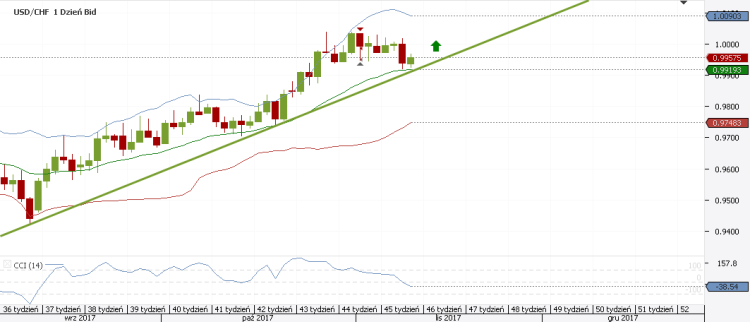 Odbicie kursu od dolnej linii trendu wzrostowego łączącej ostatnie dołki zapowiada powrót do wzrostów.Na wykresie 1-dniowym wyrysowała się duża świeca wzrostowa. Możliwe wzrosty do poziomu 1,00800