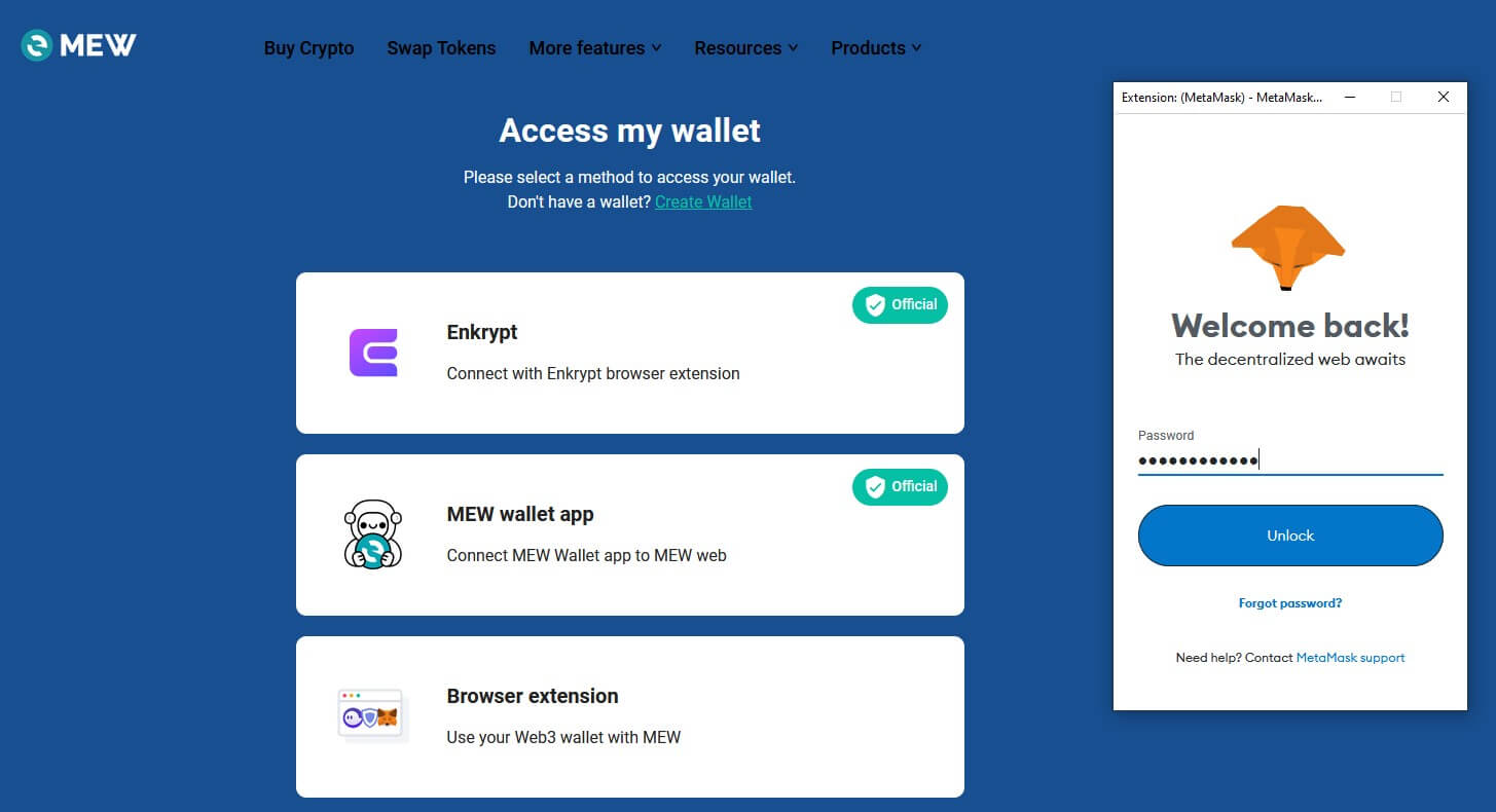 افتح صفحة ”الوصول إلى محفظتي“ باستخدام متصفح سطح المكتب واختر طريقة الوصول إلى محفظتك (في هذا المثال، يتم الاتصال عبر MetaMask ملحق المتصفح؛ ومع ذلك، يمكنك اختيار الطريقة الأنسب لك، بما في ذلك التخزين البارد/محافظ الأجهزة).