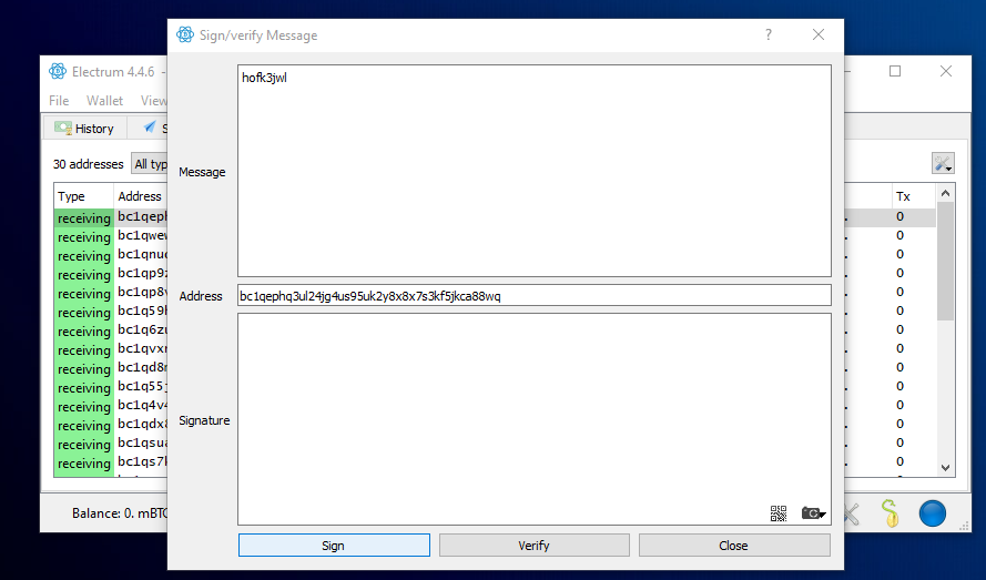 فيما يلي مثال على كيفية توقيع رسالة باستخدام عنوان بيتكوين باستخدام Electrum Bitcoin Wallet.