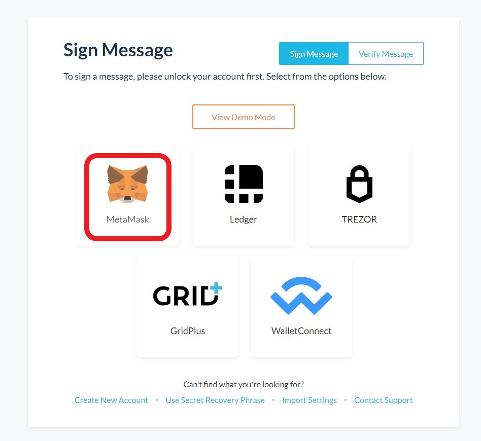افتح صفحة ويب ”توقيع الرسالة“ باستخدام متصفح سطح المكتب الخاص بك واختر طريقة الوصول إلى محفظتك (في هذا المثال، يتم الاتصال عبر ملحق متصفح MetaMask؛ ومع ذلك، يمكنك اختيار الطريقة الأنسب لك، بما في ذلك التخزين البارد/محافظ الأجهزة).