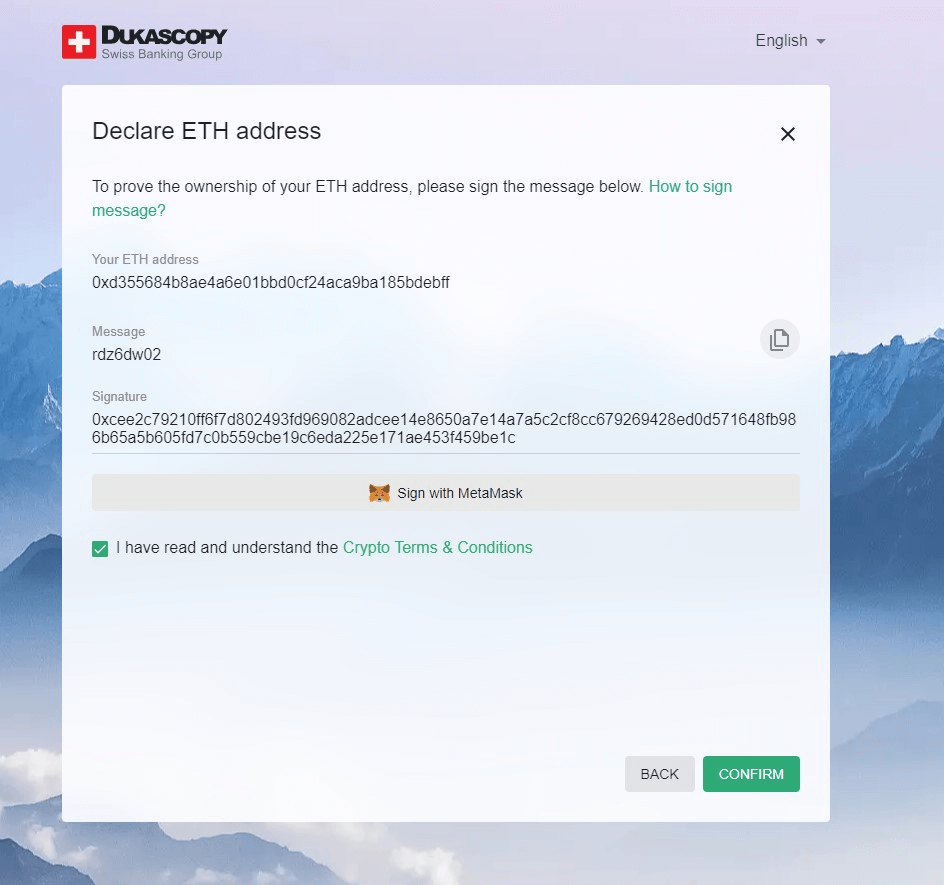 عندما يعلن العميل عن عنوان محفظة للعملات المشفرة الخاص به (الايثيريوم أو البيتكوين) الذي سيتم استخدامه لعمليات تحويل العملات المشفرة التي يتم إجراؤها من حساب العميل مع دوكاسكوبي، يجب عليه / عليها التوقيع على رسالة فريدة مُقدَّم بواسطة دوكاسكوبي بالمفتاح الخاص للمحفظة المُعلنة. يمثل التحقق الناجح من التوقيع الناتج دليلاً تقنيًا على سيطرة العميل على العنوان المعلن.