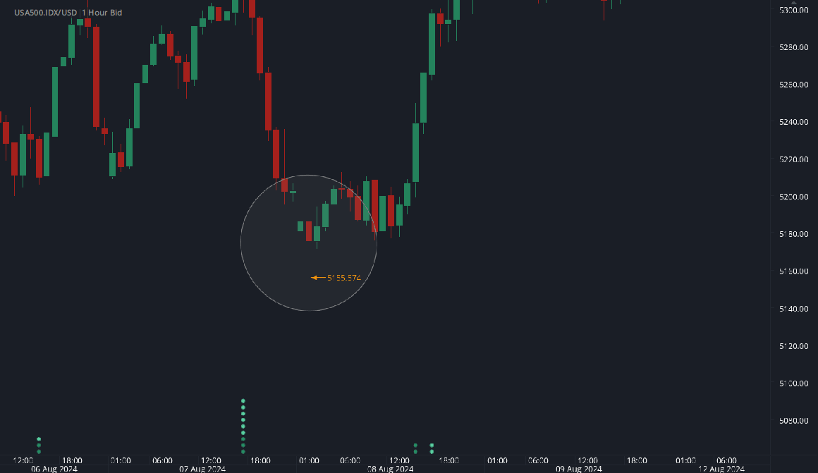 Imagine you're analyzing USA500.IDX/USD chart and spot a hammer pattern emerging after a prolonged downtrend. The long lower shadow suggests aggressive selling, initially pushing the price lower. However, by the closing time, buying pressure stepped in, driving the price back up towards its opening level.
