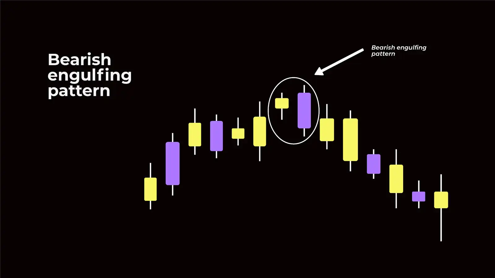 A Bearish Engulfing forms after an uptrend, where a large red candle engulfs a smaller green one. This indicates that sellers have overpowered buyers, increasing the chances of a price drop.