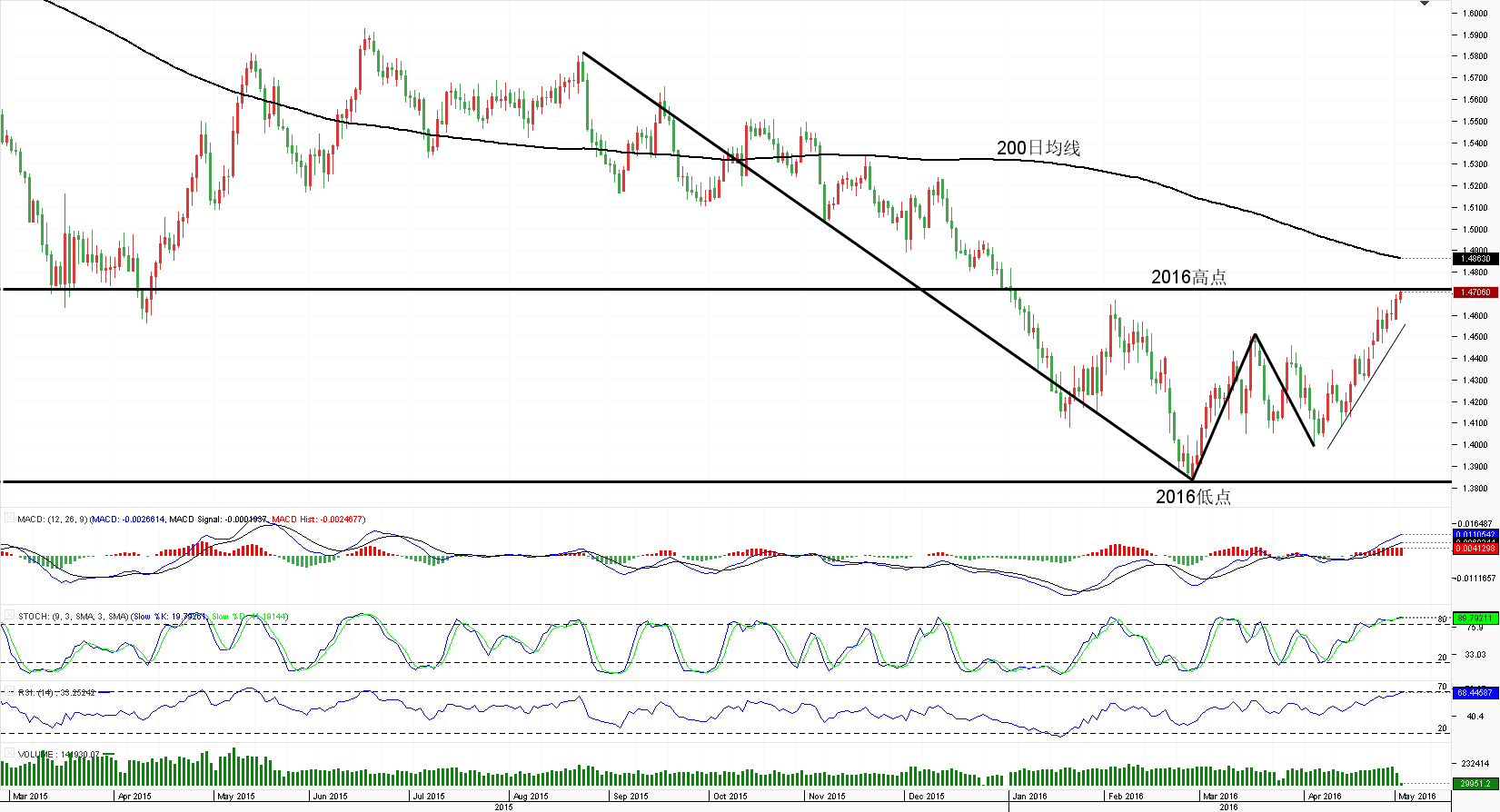 英镑兑美元在上周单边上涨,一度突破布林带中轨、前期高点1.4510、55日和100日均线并且创出今年新高,55日均线开始拐头,目前行情总体震荡偏多。但由于200日均线在价格上方运行并且向下,所以目前还不能完全确定汇率处于多头趋势。此外,4小时级别动能指标出现顶背离,所以不排除今日出现回调行情。今日上方主要阻力位为周R1(1.4718)和布林带上轨1.4827;下方支撑位为周PP(1.4560)和前期高点1.4513。
