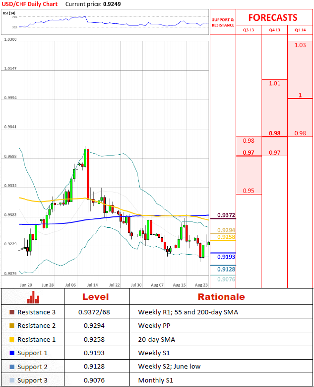 即使近期和中期技术指标显示货币对相当悲观,相对于看多一方,它仍保持着向上的偏好在六月的低点0.9128翻转之后。唯一显着的分隔美元兑瑞郎的水平来自于关键阻力位位于0.9342/68,20天均线周枢轴位分别位于0.9258和0.9294。