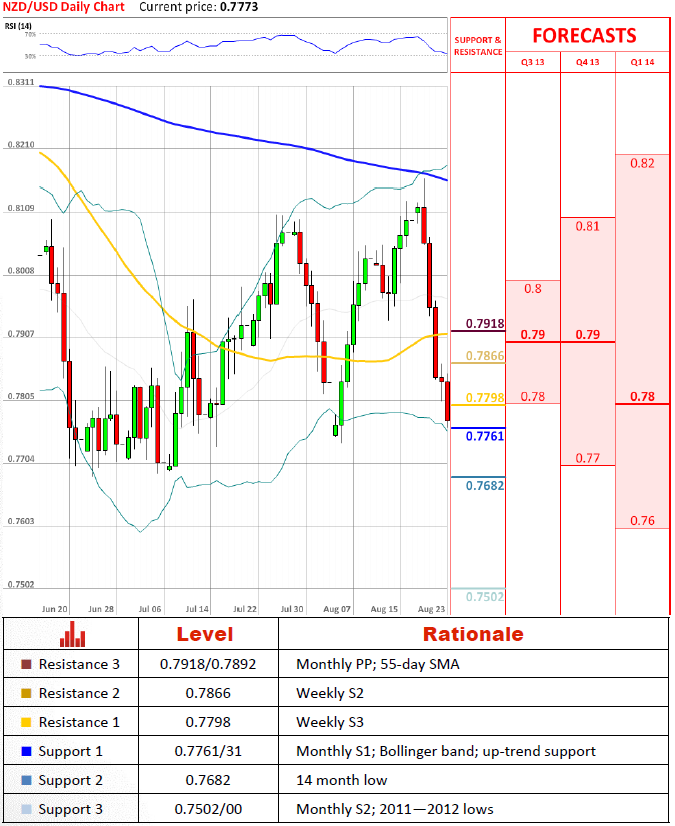 货币对已经失去的价值甚至超过它8月前两周获得的。它似乎成功地巩固在78美分下方,目前受77.6/3美分区域的支撑。短期技术指标给出看跌信号表明一些8月份第一部分的多头可能在这里。如果77.6没能在货币对上停止,我们可以很容易地期待它跟踪到76.8美分。短期上涨应该受限于78.6美分。