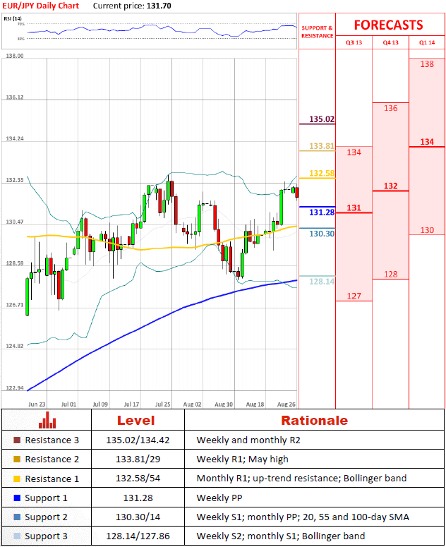欧元兑日圆近期已经面临阻力位132.58/54,由主要上升趋势线形成,开始的日期回到2012年下半年。因此,它将合理的预计在它重新开始提升之前来自目前水平的抛售。下跌可能通过中间支撑位131.28推动,并且扩展下跌到一个更合理的区域130.30/14。