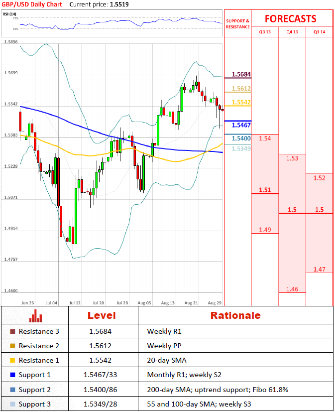 货币在两次下跌到1.55以下后获得了周第二支持位的支撑。然而,我们公平的看来,已经认可货币对在最近的几天做出的类似的举动,以远离在图中又一次下跌至1.55以下的情况。目前,货币对交易在20天均线,其可以很容易地受到空头和多头的双边推动,但在中长期总体趋势应该继续看跌。