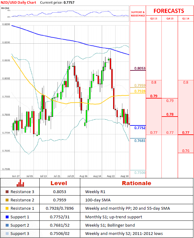 当我们预计在新西兰元兑美元下行趋势的持续性,基于的前提是现货价格在200小时的移动平均线下方,现在更多的理由相信新西兰元在或者即将触及底部。关注点是否货币对将能够维持向下很大程度上出现在月研究转向多头,对于九月现在只有两种指标给出‘卖出’信号。
