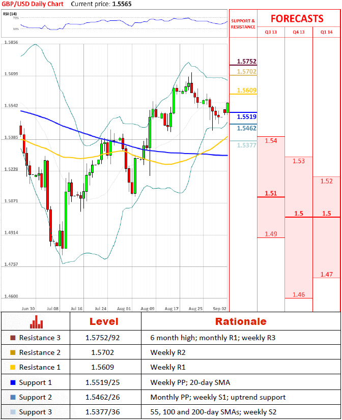 货币对本周开始从周枢轴位 / 20天均线反弹。我们确信上升趋势支撑(连接七月9号和八月2号的低点)同样有一定的影响。以这样的步调货币对将不久会测试1.56,我们可以期待第二顶部的形成,首先是已经结束的8月21日。无论如何,如果货币对突破上升趋势支撑失败,我们将可以预期它被抛售到55,100和200天的均线,以一个相当温和的步伐。