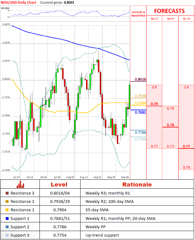 既不是55也不是100日移动平均线足以控制新西兰元的看涨继续提高加速步伐。货币对阻力位目前面临由月第一阻力位和周第三阻力位水平形成的,尽管现在区域似乎不能够经受得住买入压力,因此允许新西兰元兑美元下一个目标0.81。