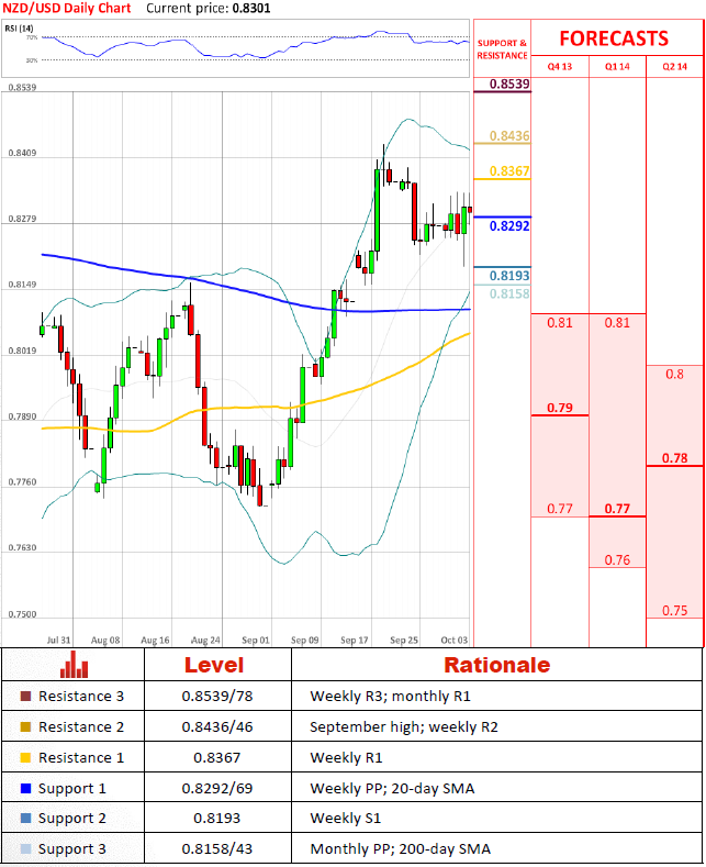 假如货币对下跌到0.82以至于需要冲力去提升到0.83。目前它似乎被巩固在20日均线上方,将保持货币对在不久的将来受到支撑。温和看涨也被短期技术指标表明。然而,为了提升所有的下行压力,货币对在之后应该提升到0.837和0.843上方。跌破0.815可能引发并积极抛售79美分,是主要市场参与者预期中值的位置。