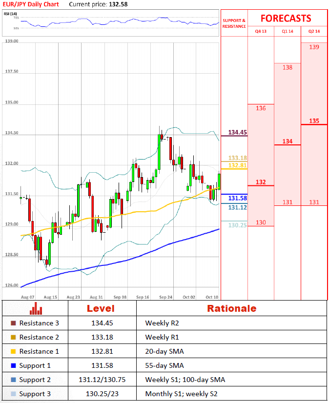 货币对昨天没能在周和月枢轴位,但今天重新测试它。公平地说,货币对已经稍微在它上方交易,但确定突破它应该提升到20日均线上方。如果它发生,我们可能预计周第一阻力位将被轻易地突破。可能放入134.5。万一货币对没能提升到涉及到的均线上方,它应该跌到131.1日圆,但因为我们已经看了好几次了,在短期它应该阻止进一步下跌。