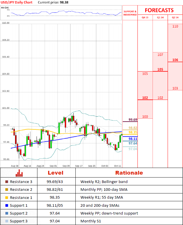 尽管下降趋势线挡在97.64,美元兑日元已成功地上涨并已经交易在200日均线以上,对于上涨势头同样造成一个相当大的威胁。现在,考虑到月技术研究看涨,该货币对已突破了55天和100天移动平均线,准备接近九月高点100.62。