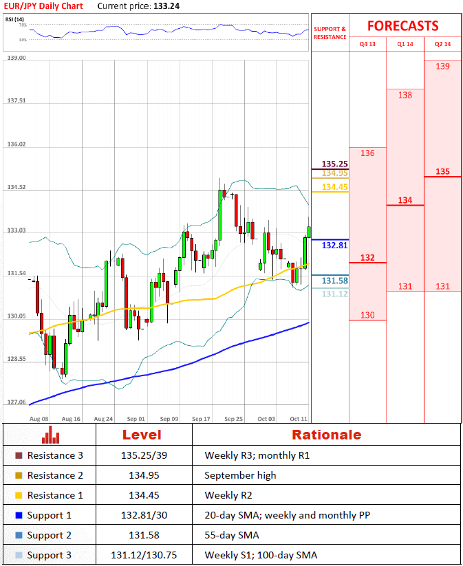 货币对已经相当一段时间看跌,但它似乎看涨冲力通过55日均线给予的已经提示了来自货币对的大部分压力。目前它似乎已经巩固在20日均线/周和月枢轴位上方。尽管缺乏强劲的较高的阻力位,由于短期技术指标的中立,我们预计货币对将回调一点,但在即将到来的几周将再一次加快步伐,正如中期和长期指标表明的那样。