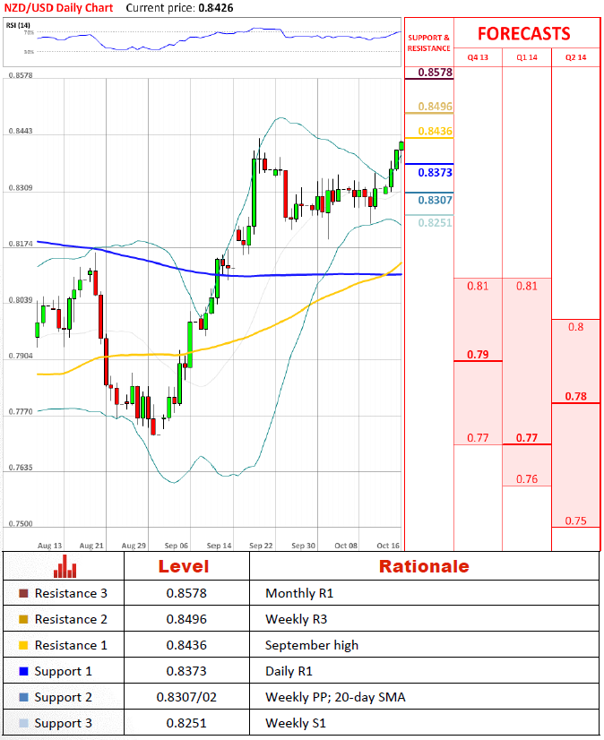 货币对持续升值在从周枢轴位/20日均线反弹后。目前它尝试提升超过9月高点。如果它设法那样做,货币对应该提升超过0.849为了减少回调的可能性。万一货币对没能在9月高点,我们并不预计它将移动到更低位。它应该至少一段时间在0.837上方徘徊。