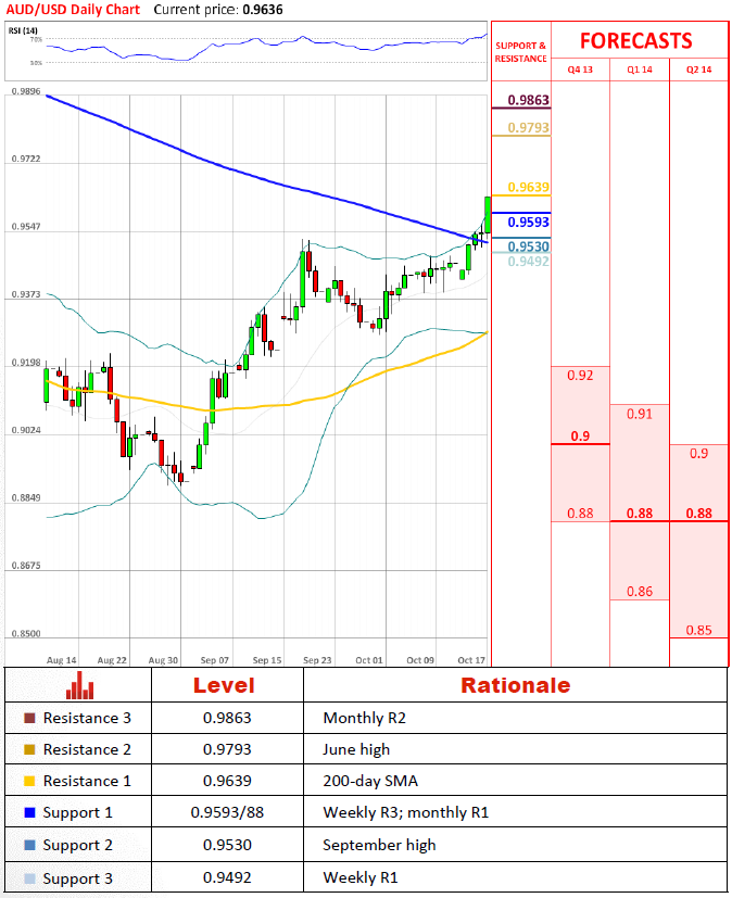 货币对已经成功地突破9月高点,目前测试200日均线。如果货币对提升超过它,可能放入6月高点在0.979。在这里失败可能激发一种抛售,应该找到支撑在9月高点0.953上。跌破它可能让货币对走向0.925。