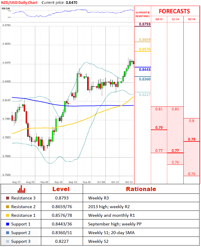 货币对正显示出较小的空头并且目前正在测试9月高点支撑位的强度。如果货币对跌破它,它可能轻易地向后延伸到0.836下方,将放入0.823。为了提升一些这种压力,货币对应该提升超过周和月第一阻力位。将放入2013年高点并且我们可能看到一些严峻的空头可能引起货币对主要的失败。
