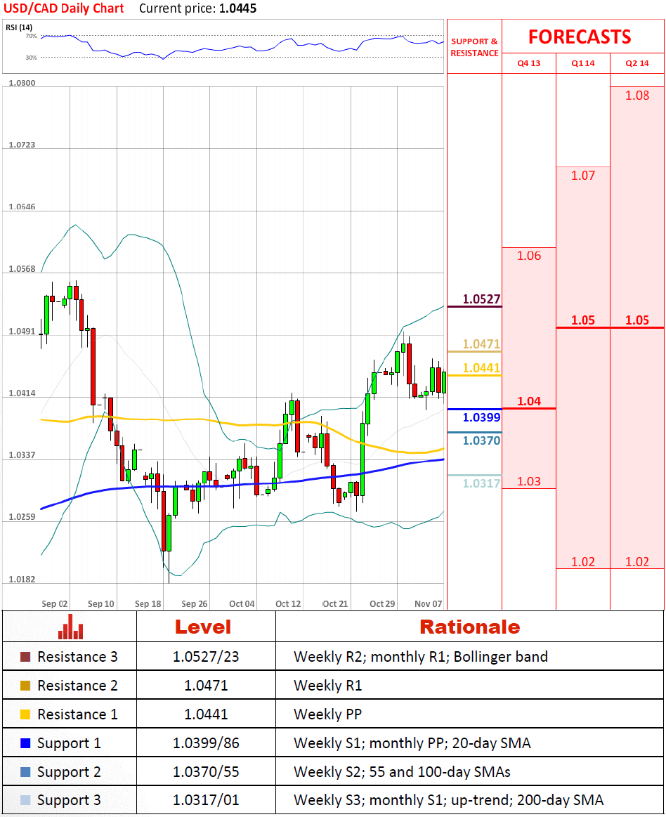 在10月美元兑加元反弹到主要看涨趋势线(它已经超过一年多是有效的)。因此,有好的理由去怀疑美元将不会停止提升,但将设法战胜最近的阻力位,例如周枢轴位1.0441,维持上行轨道至少直到达到7月高点1.06。