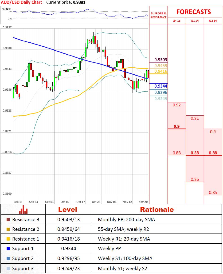 货币对正在显示出大量的看涨,似乎能够提升超过55日均线,但没有设法尝试那样做。我们不认为这应该有任何短期或中期含义。万一它做了,短期支撑将在100日均线0.9295附近。在这里失败了可能触发一种抛售到标记的92美分。我们预计货币对在不久的将来通过100和200日均线有一点区间震荡。
