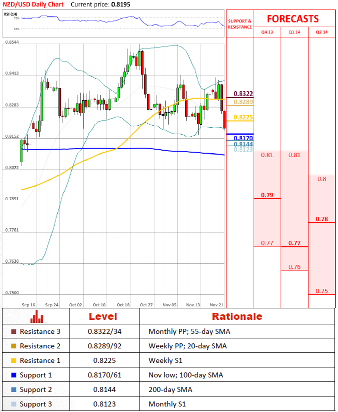 货币对在昨天失败之后继续贬值并且已经下跌到100日均线。目前它旨在200日均线。我们希望它持有最初的测试,但在之后它有点过早的谈论从中期到长期的发展。最有可能是货币对将横盘一段时间,但将面对重大的下行风险。跌破200日均线可能驱使一种抛售直到80美分区域。