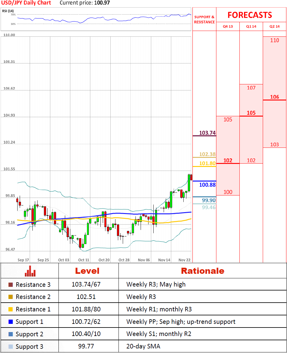 经过一个短暂的缓解,上周五美元兑日元价格继续上涨,已经测试了月第三阻力位和周第一阻力位。 一旦这个障碍被克服,货币对目标应该会朝向五月高点103.74/67。周第二阻力位站在这些级别中间,极不可能长期保持乐观的势头。