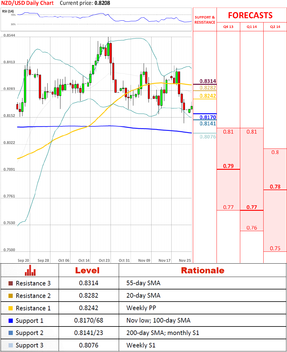出乎意料地货币对正显示看涨偏好,似乎在上周跌破200日均线之后正在恢复。目前它似乎挣扎于周枢轴位。为了中立回调的潜在风险它应该提升超过55日均线。万一失败了我们非常有可能看到一种抛售到周第一支撑位。如果没能停止货币对贬值,我们有可能看到它走向标记的80美分。