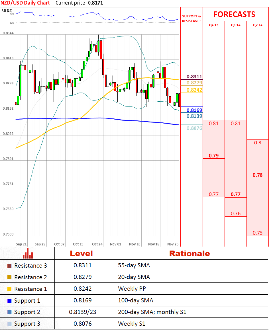 货币对峰值超过周枢轴位,但没能在这里巩固,因为在20日均线上失败了。目前它正在测试100日均线。我们希望货币对在不久的将来超越并且测试200日均线的一些组。跌破它将放入周第一支撑位。在这里失败它可能轻易地驱使一种抛售直到79美分,是主要市场参与者平均预期的位置。
