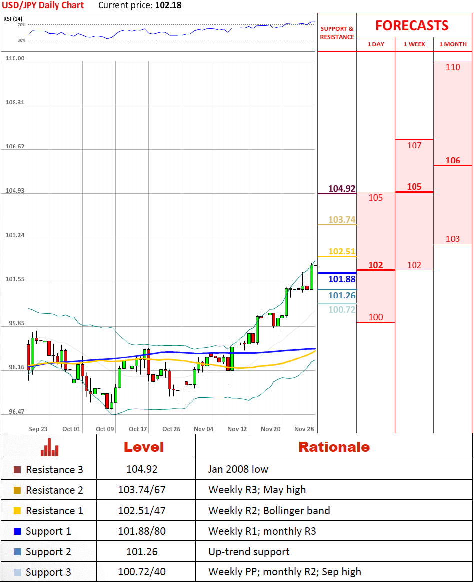 顺利的使用上升趋势的支撑线在101.26作为一个跳板,美元兑日元能够穿过101.88/80,包括月第三阻力位和周第一阻力位。现在,简要整理之后,货币对预期目标为周第二阻力位在102.51。那里汇价与五月高点将只有120点的距离。