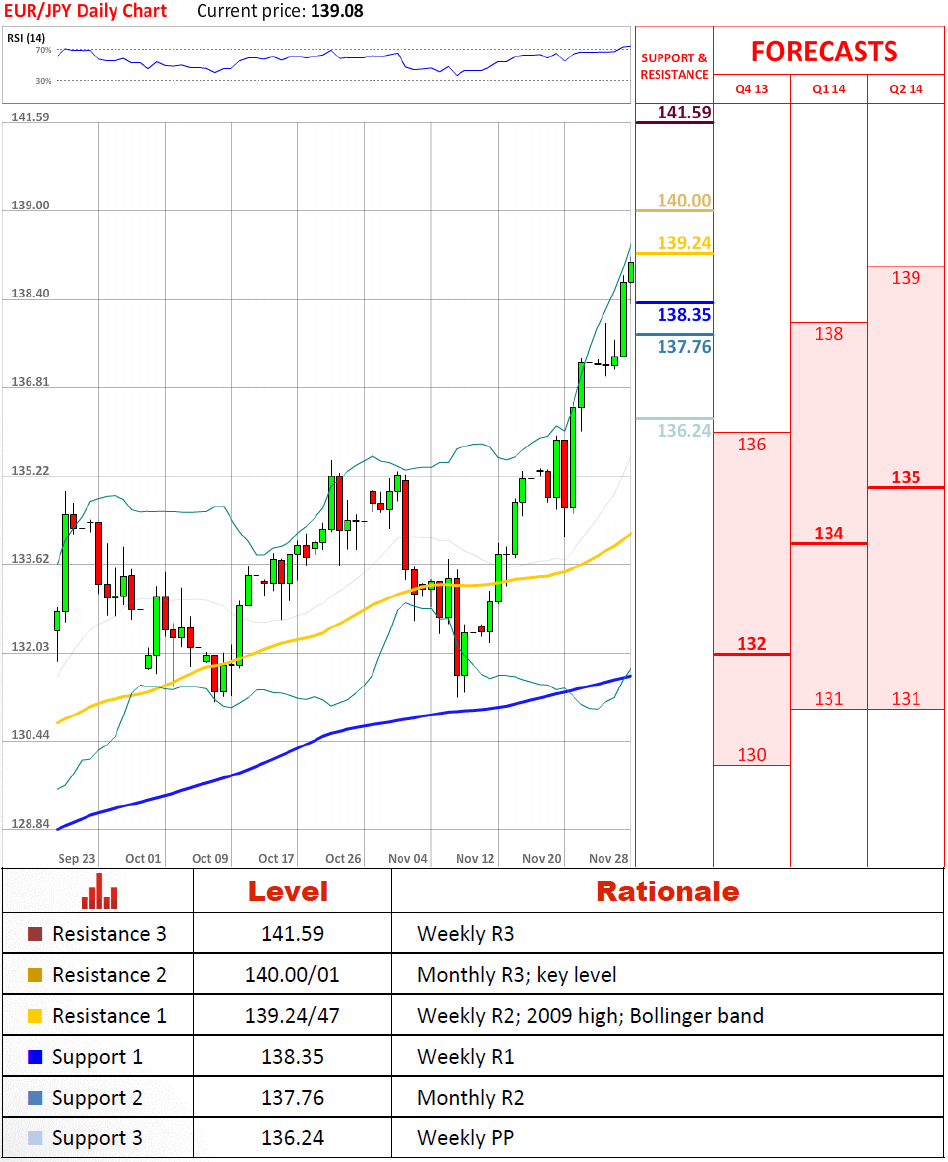 货币对今天过早地后退,但找到支撑点在周第一阻力位,再次开始上涨并且目前旨在2009年高点。我们认为它不再轻易放弃并且货币对在短期内可能再次跌到周第一阻力位或者月第二阻力位。然而在中期,我们希望它被突破并且关键水平在140日圆在不久的将来被测试。万一意外地失败了,货币对不应该在短期内下跌低于周枢轴位。