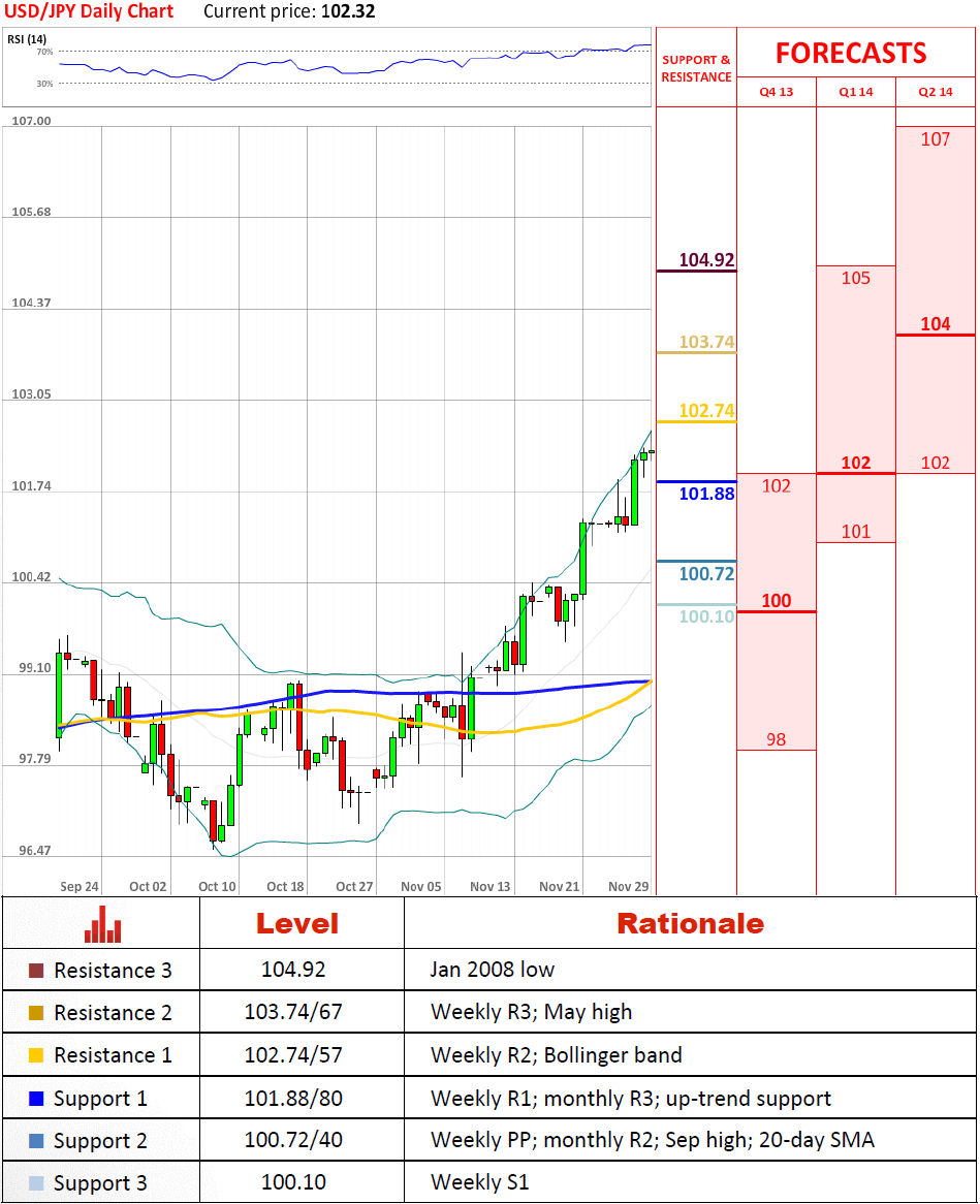 虽然起初美元兑日元试图突破阻力102.74/51,但是昨天结果并没有成功,最终货币对应该会突破这个水平并恢复朝向五月高点103.74的走势,同样是周第三阻力位的当前位置。 之后,美元目标可能会瞄向2008年1月低点,位于104.92。