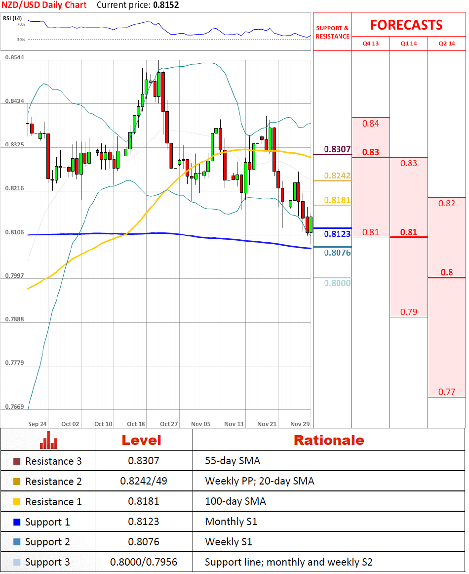 货币对继续贬值,但找到支撑点在周第一支撑位并且回到月第一支撑位上方。我们不希望货币对在100日均线上方扩展收益。它可能引起另一种抛售,货币对可能跌到0.80。为了提升大部分这种压力货币对应该峰值超过20日均线。