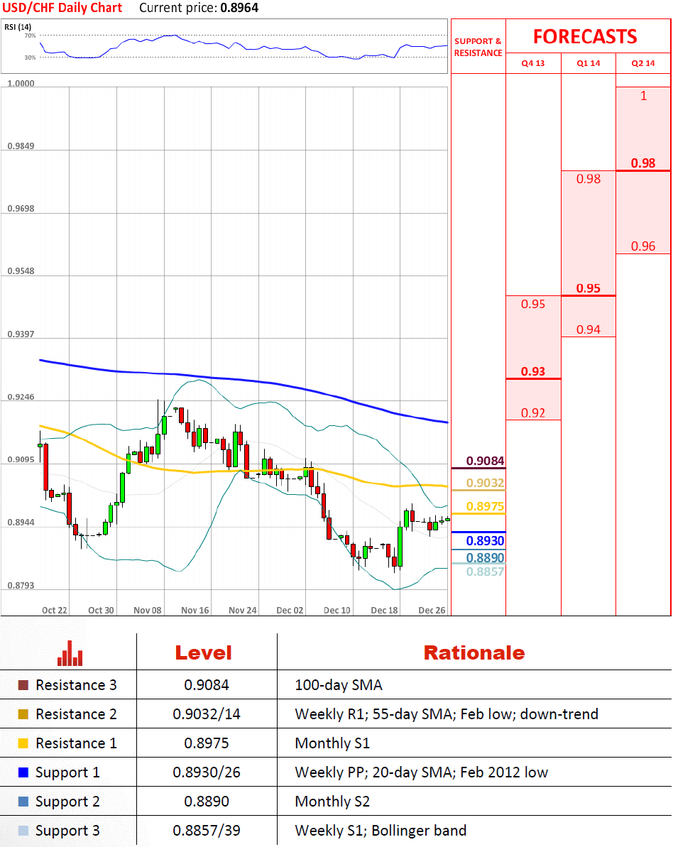 经过触及0.8930/26之后,美元兑瑞郎现在正慢慢走向0.8976。 反弹可能延伸到下跌趋势阻力线在0.9031/13,但应该会受到该点位的限制,因为该供给区域受到了二月低点和55天均线的增强。同时,技术指标是混合的,因此并没有暗示任何特定的方向。