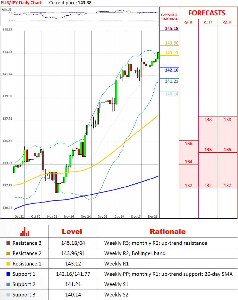 在最近的阻力位之间,既不是周第一阻力位143.12也不是周第二阻力位143.96/91被预期阻碍目前的上涨。然而,上升趋势线在145.18/04,一直在自从2011年末以来的合适位置,可能鼓励获利了结,可能导致下滑到142.16/141.77,尽管2009年高点在139.62/03也可能成功地支撑货币对。
